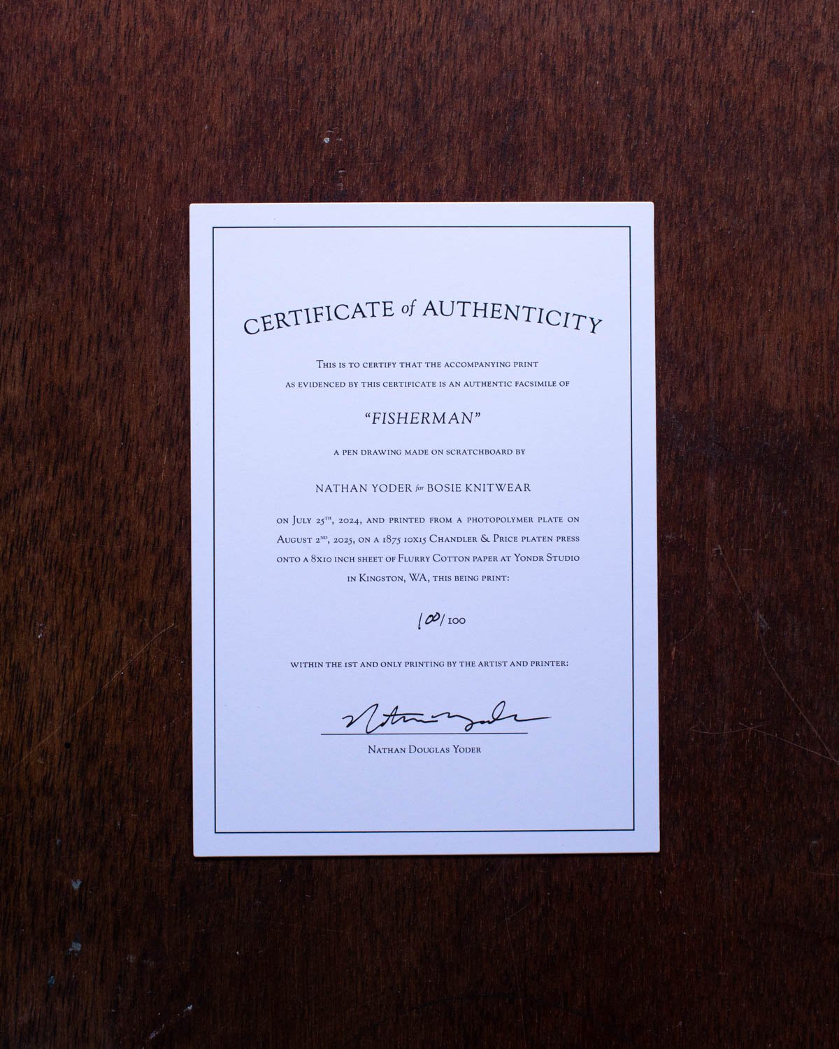Printed by the artist on a 1889 Chandler & Price platen press from photo polymer plate on July 25th, 2025.